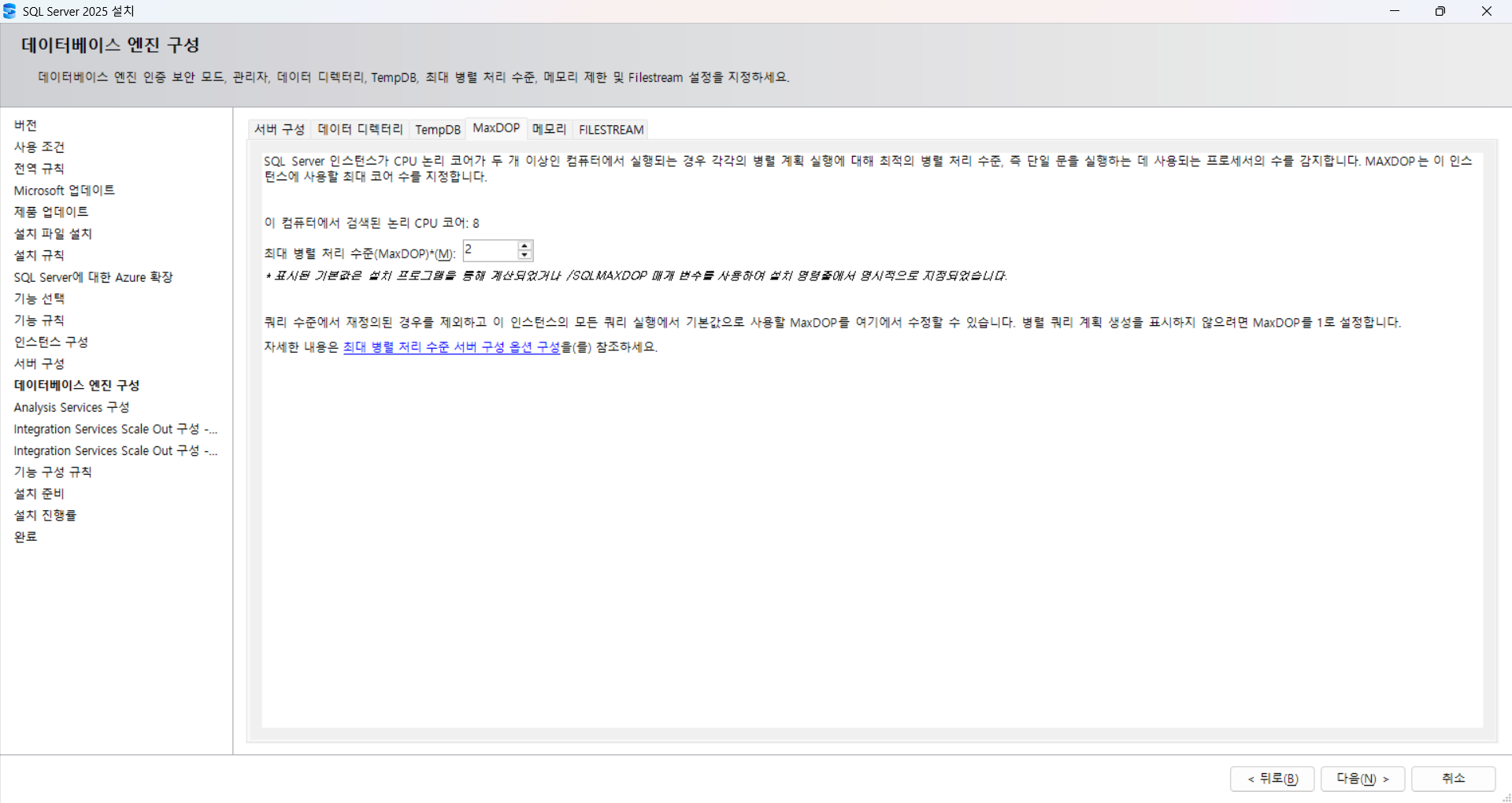 인스턴스에 사용할 최대 CPU 코어 수(MaxDOP) 지정